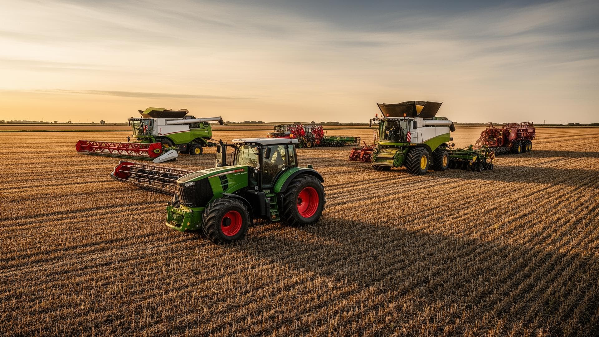 Tractors, harvesters, planters, sprayers, and farm equipment.